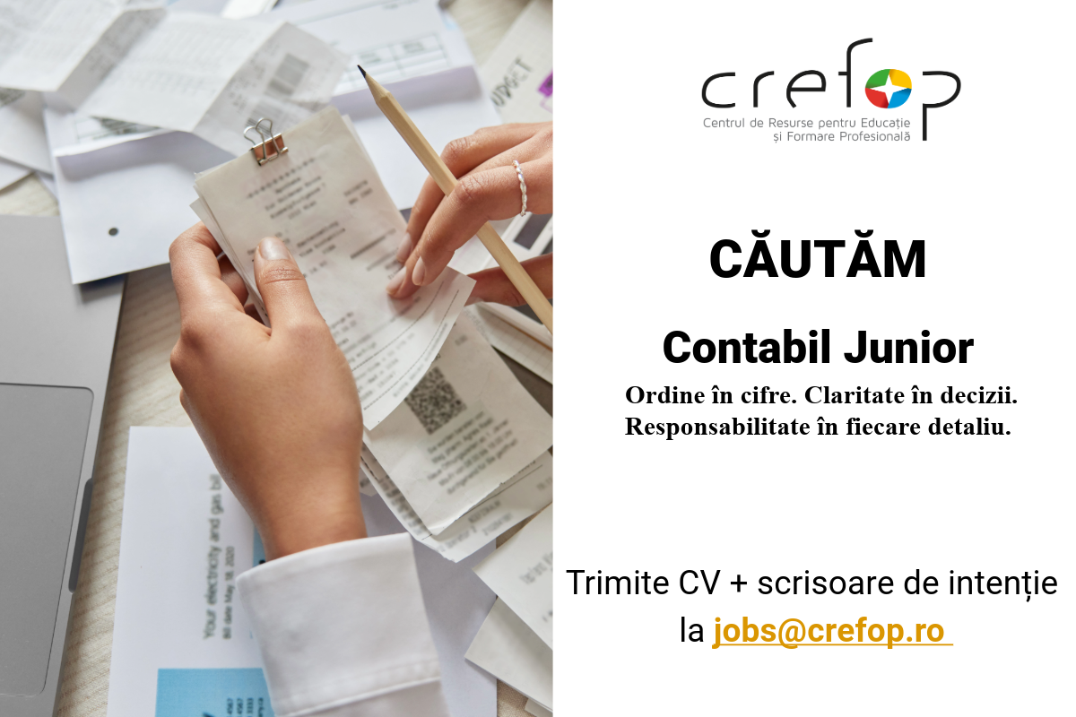 Fundația CREFOP își extinde echipa și caută un Contabil Junior care să contribuie la gestionarea activităților financiare și contabile ale organizației, într-un cadru profesionist, riguros și orientat spre dezvoltare.