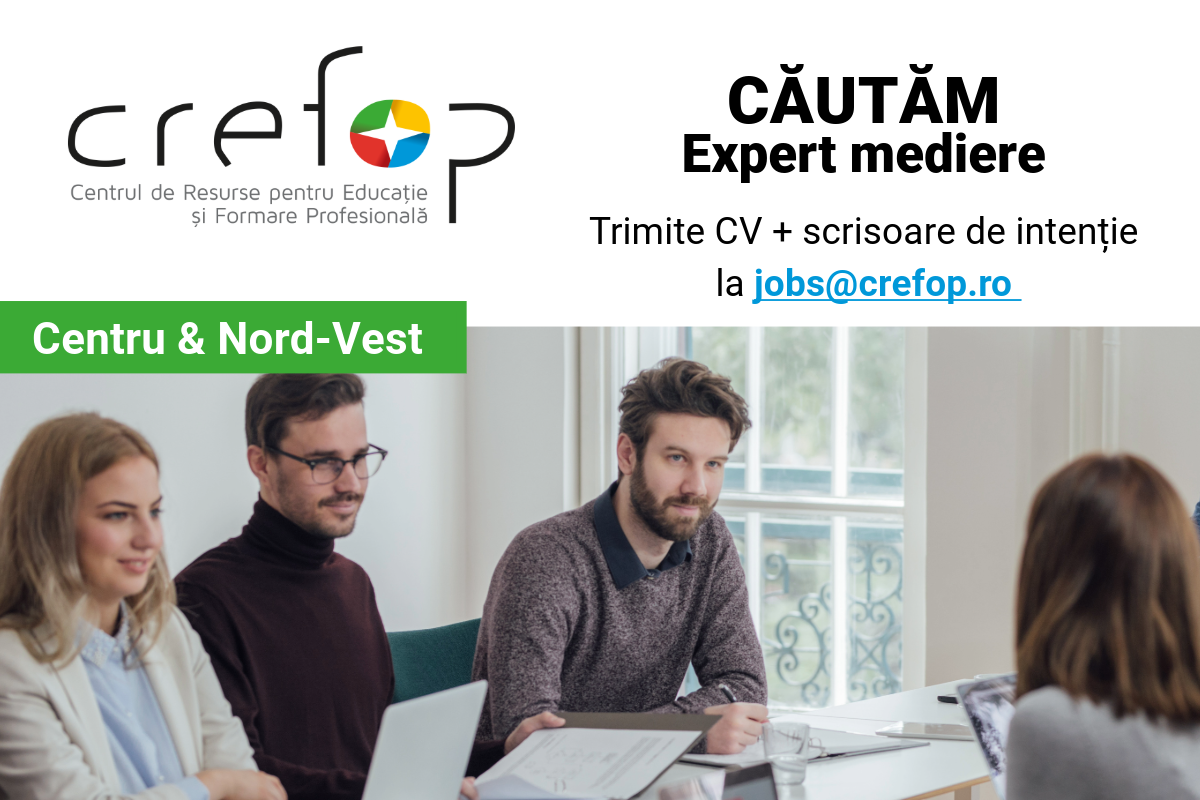 📩 Dacă te regăsești în acest profil, trimite CV-ul și o scrisoare de intenție la jobs@crefop.ro, cu subiectul: Expert Mediere – [Regiunea].