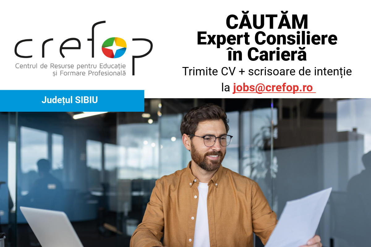 Fundația „Centrul de Resurse pentru Educație și Formare Profesională” (CREFOP) recrutează Expert Consiliere, cu normă part-time / full-time, pentru regiunea Centru – SIBIU