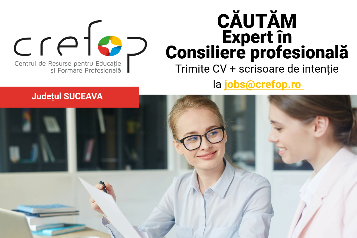 Fundația „Centrul de Resurse pentru Educație și Formare Profesională” (CREFOP) recrutează experți în consiliere profesională, în județul Suceava.