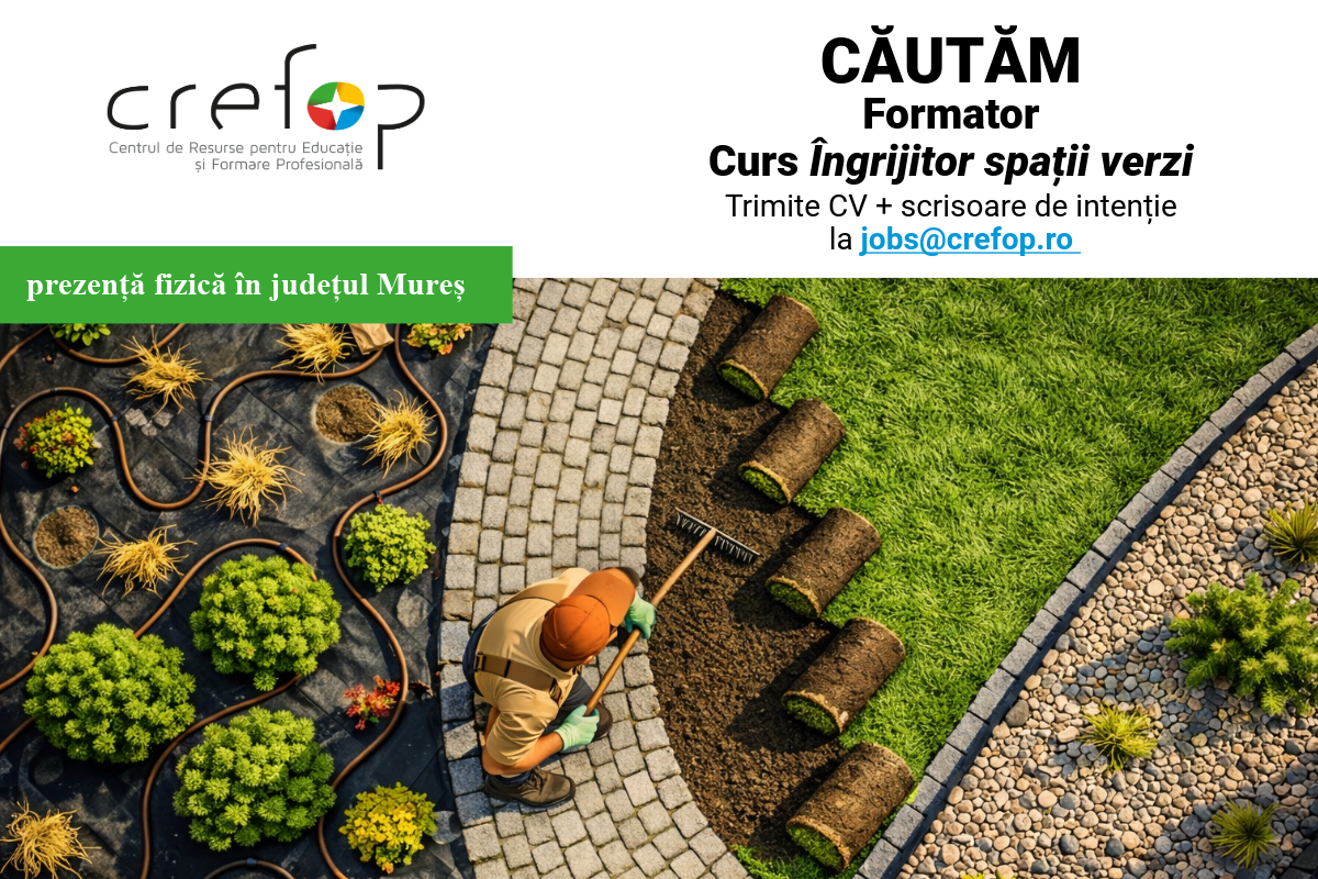 Fundația CREFOP caută un formator colaborator pentru susținerea cursului de Îngrijitor spații verzi, în județul Mureș (1 poziție, prezență fizică, perioadă determinată).