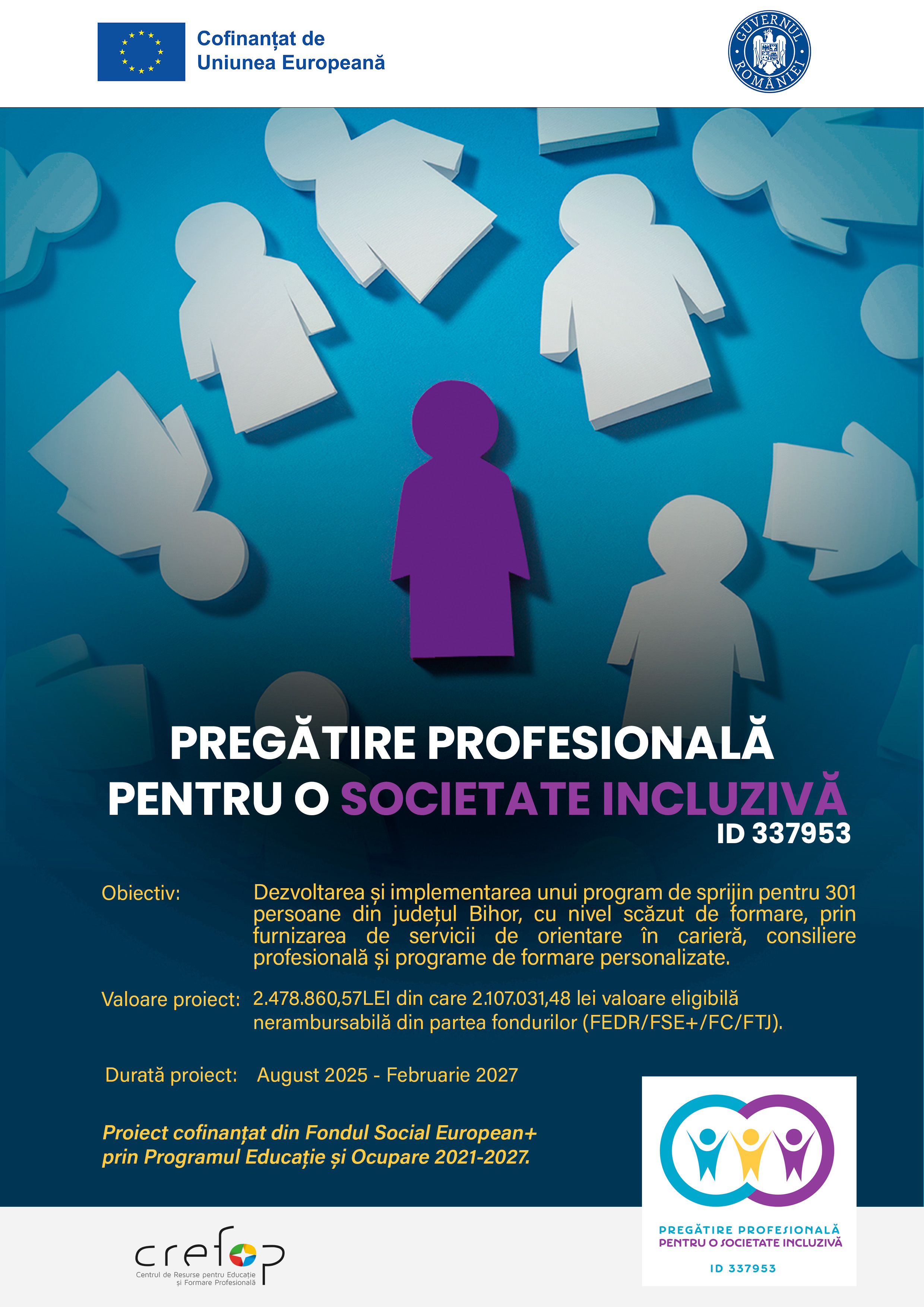 Fundația Centrul de Resurse pentru Educație și Formare Profesională (CREFOP) lansează proiectul „Pregătire Profesională pentru O Societate Incluzivă”, o inițiativă care le deschide persoanelor cu nivel scăzut de formare din județul Bihor drumul către calificări recunoscute și locuri de muncă stabile.